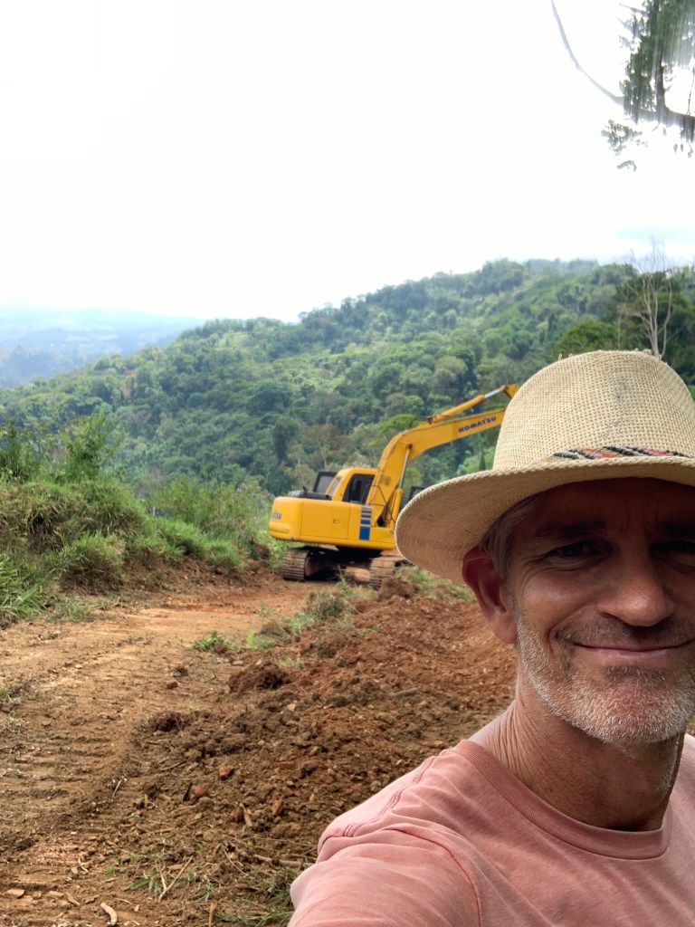 In 2023 and 2024, Kim helped design and carried out the implementation of access, water supply and planting for a 200 acre permaculture farm high in the hills above Platanillo. The farm spans from a ridge dropping over 500′ to a steep gradient river below. Lots of steep slopes, shifty soils, multiple springs, pasture grass and cows to deal with. The challenge was how to bring a road from top to bottom accessing multiple building sites (caretaker’s casita, guest casitas, main house, green house, workshop, etc.) with multiple steep stream crossings. The road mostly followed an old existing rough cut road but was improved by diverging in key places.