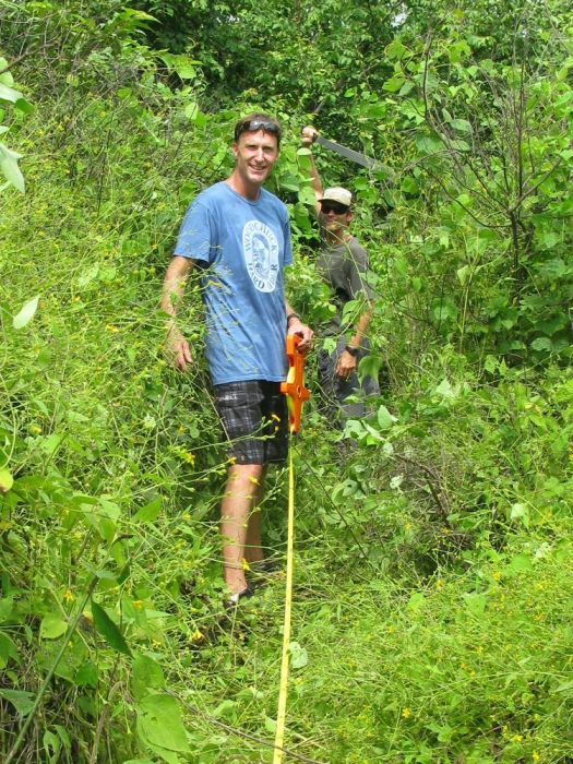 Kim with machete, and Steve with 100m tape, measuring out lots.