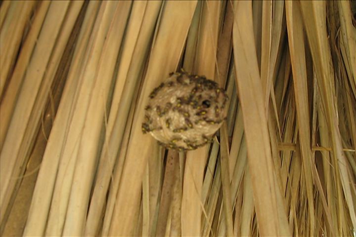 While trying to install our signal booster antennae on our new house, we heard a buzzing and came across a buzzing mess lurking under the palm fronds. Kim grabbed a plastic bag and I got in place with the camera. With a quick grab he was able to safely contain the stinging creatures within the bag and quickly chuck the swarming mess over the fence. Problem solved!
