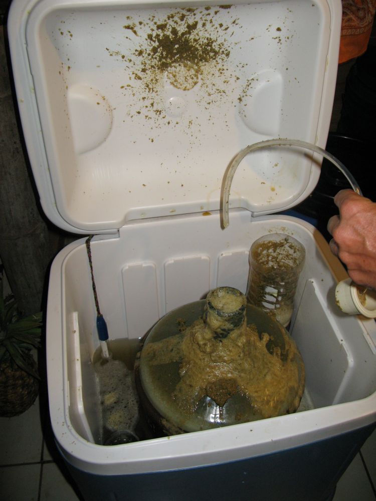 We searched the marketplace and our friends’ kitchens for a big enough brew kettle but could only come up with a 3 gallon pot. We used a 5 gal polycarbonate water jug as our carboy – purchased complete with 5 gal of purified water.