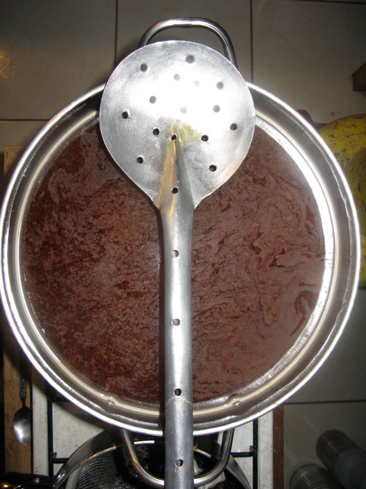 Chilling the wort as quickly as possible is important in homebrewing. We don’t have a fancy wort-chiller (yet!) so we dunked the hot wort pot in cool water baths repeatedly until the temp dropped enough to transfer the wort into the carboy and then pitch the yeast.