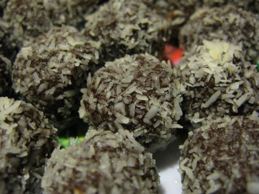 We melted the liquor in a pot, added chopped cashews, honey, some fresh raw cream, then cooled it in the fridge until it was the right consistency to be rolled into balls and coated with coconut shavings.