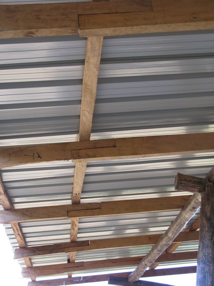 Multiple actions were discussed as to how to remedy the situation. Eventually, we decided we needed to get short pieces of guanacaste and use them to lengthen the alfajias. It was a long process (especially since there is now no power on the ridge and we had to rent a generator at a rate of about $20/day plus gas) unscrewing the roof panels, cutting the alfajia at an angle, cutting the extension at the same angle (with a non-electric hand saw), then nailing the pieces together, then screwing the roof panels back in.