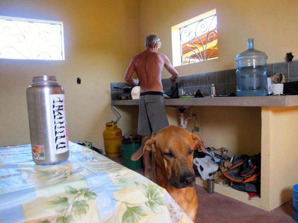 Kim does dishes with bucket water since the running water isn’t set up yet.